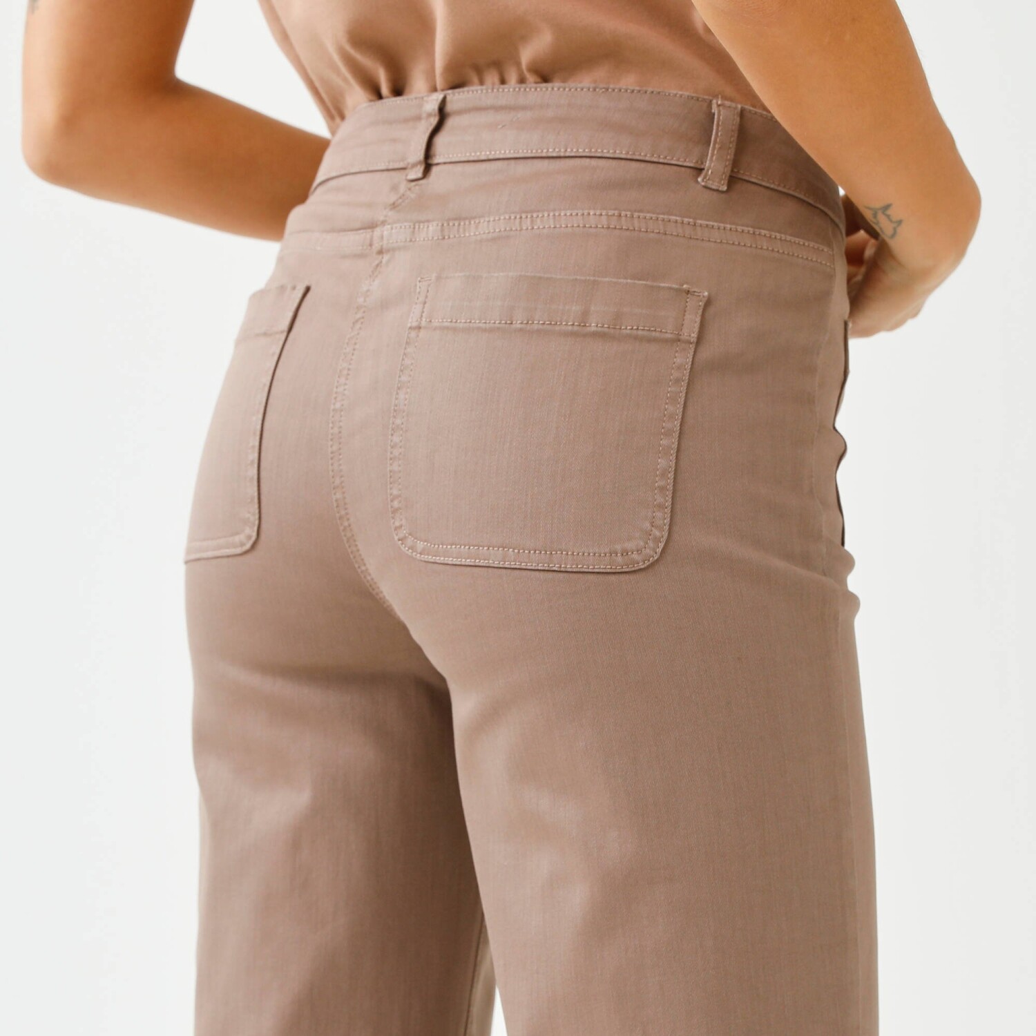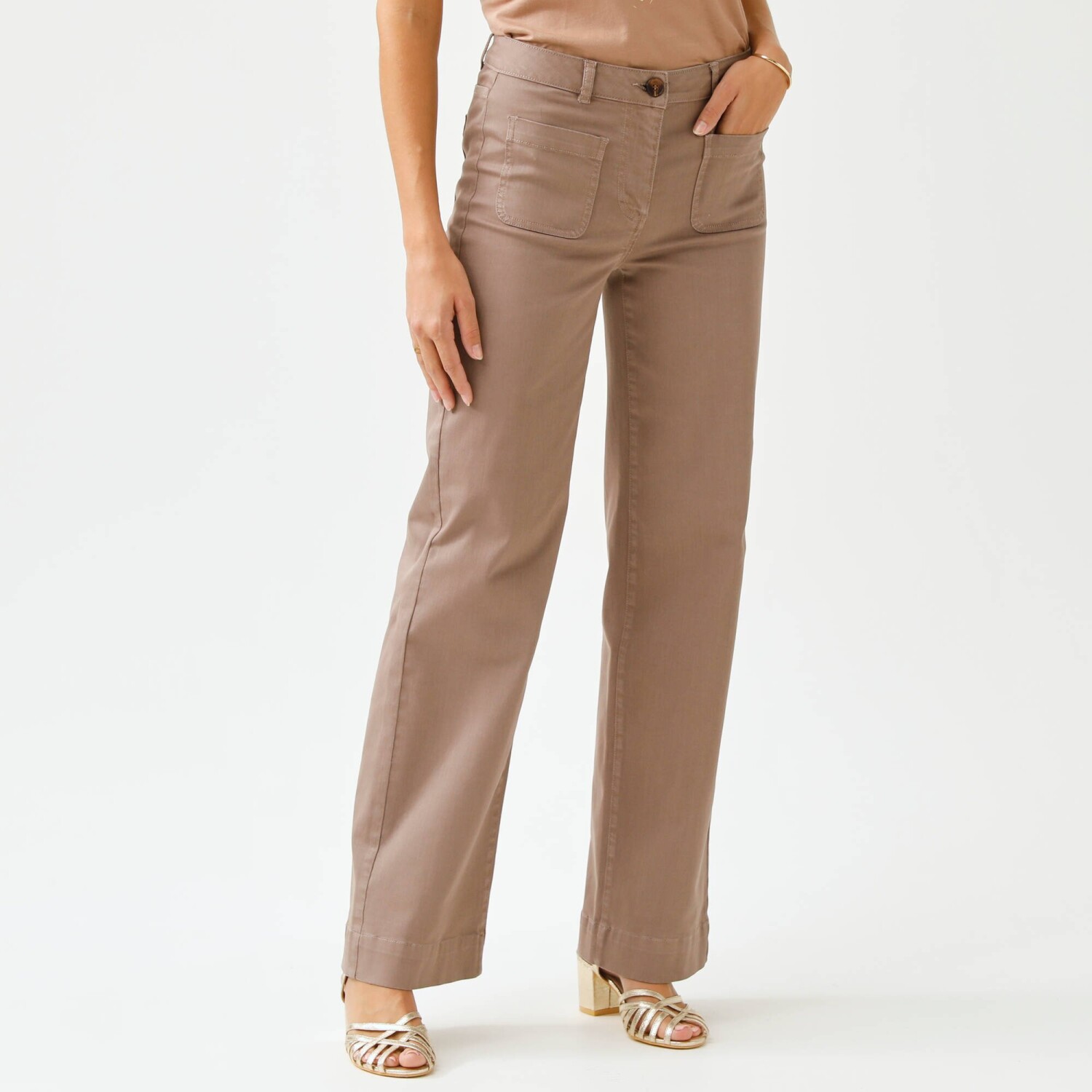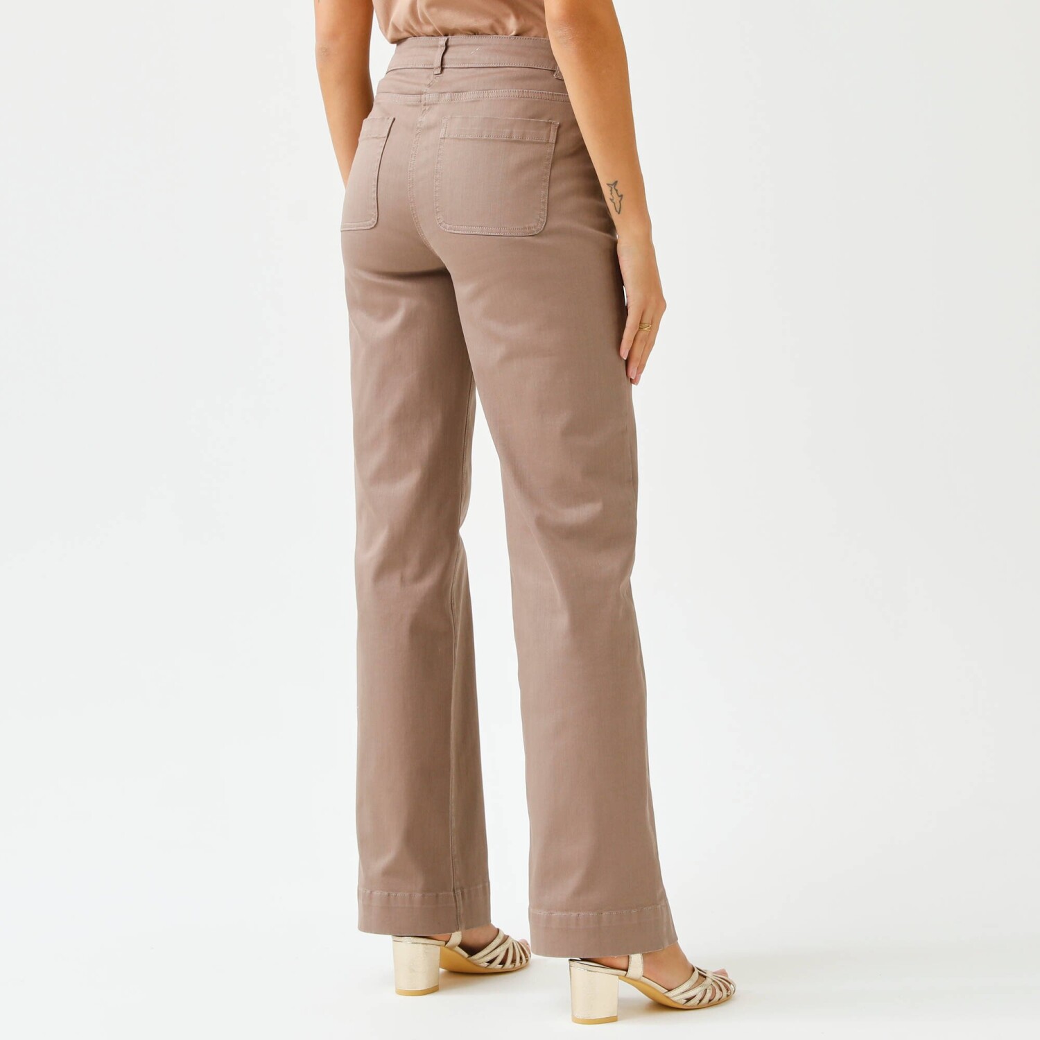 Široké kalhoty s vysokým pasem jsou speciálně navržené pro malou postavu. Široký aktuální střih. Vysoký pas. Tvarovaný pas s 5 poutky a zvýšením vzadu. Zapínání na zip + knoflík. 2 našité kapsy vpředu a vzadu se zakulacenými rohy. Nohavice zakončené prošitým lemem. Kontrastní prošití. Standard 100 podle Oeko-Tex (CQ 1216 / 3 IFTH). Tato známka označuje textilní výrobky, které byly podrobeny laboratorním testům na široké spektrum škodlivých látek a výrobek je bezpečný nad rámec platných norem. Lze prát v pračce.