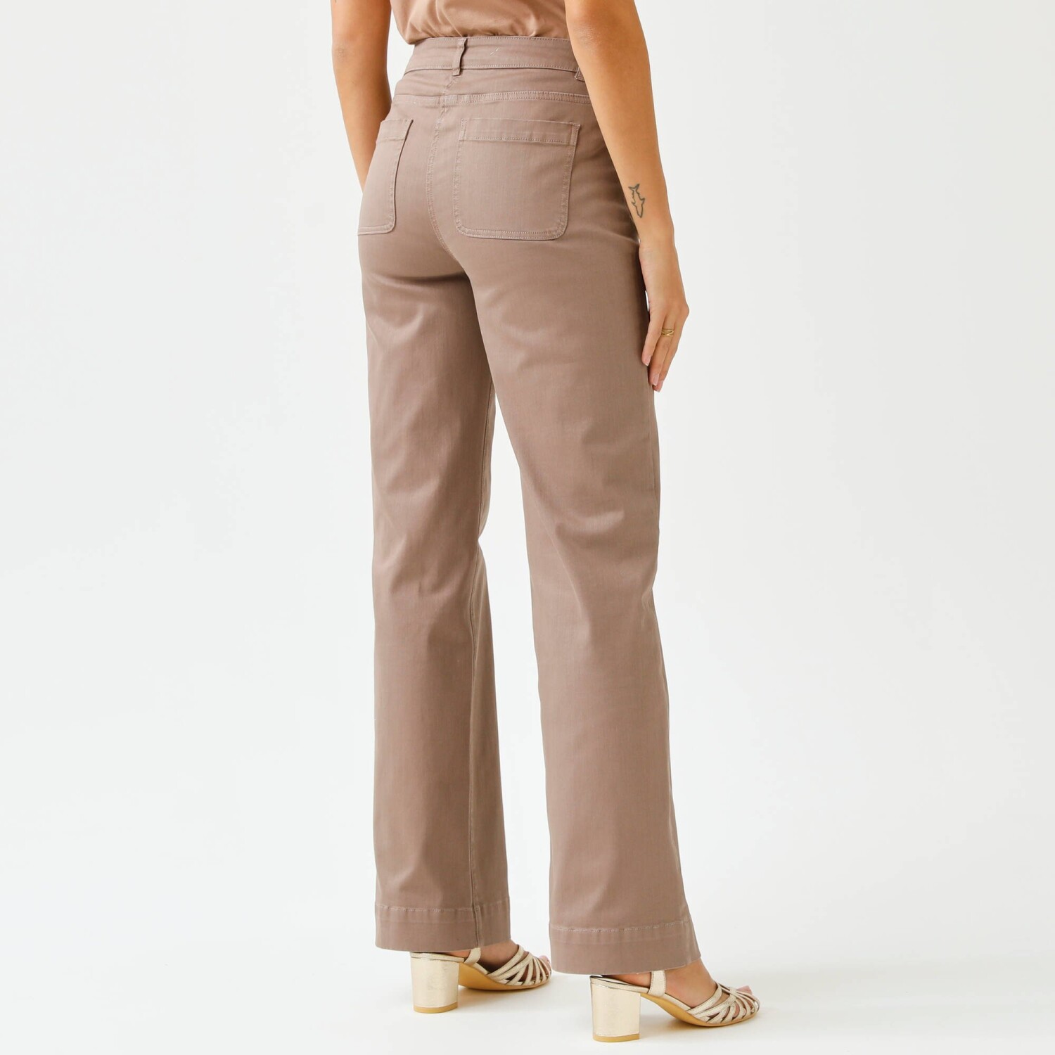 Široké džíny s vysokým pasem jsou speciálně navržené pro střední výšku postavy. Široký aktuální střih. Vysoký pas. Tvarovaný pas s 5 poutky a zvýšením vzadu. Zapínání na zip + knoflík. 2 našité kapsy vpředu a vzadu se zakulacenými rohy. Nohavice zakončené prošitým lemem. Kontrastní prošití. Certifikát Made In Green od OEKO-TEX. Kromě ověření několika stovek chemických látek, které přispívají k vysoké bezpečnosti, toto označení zaručuje ohleduplné výrobní principy a kontrolované společenské postupy. Lze prát v pračce.