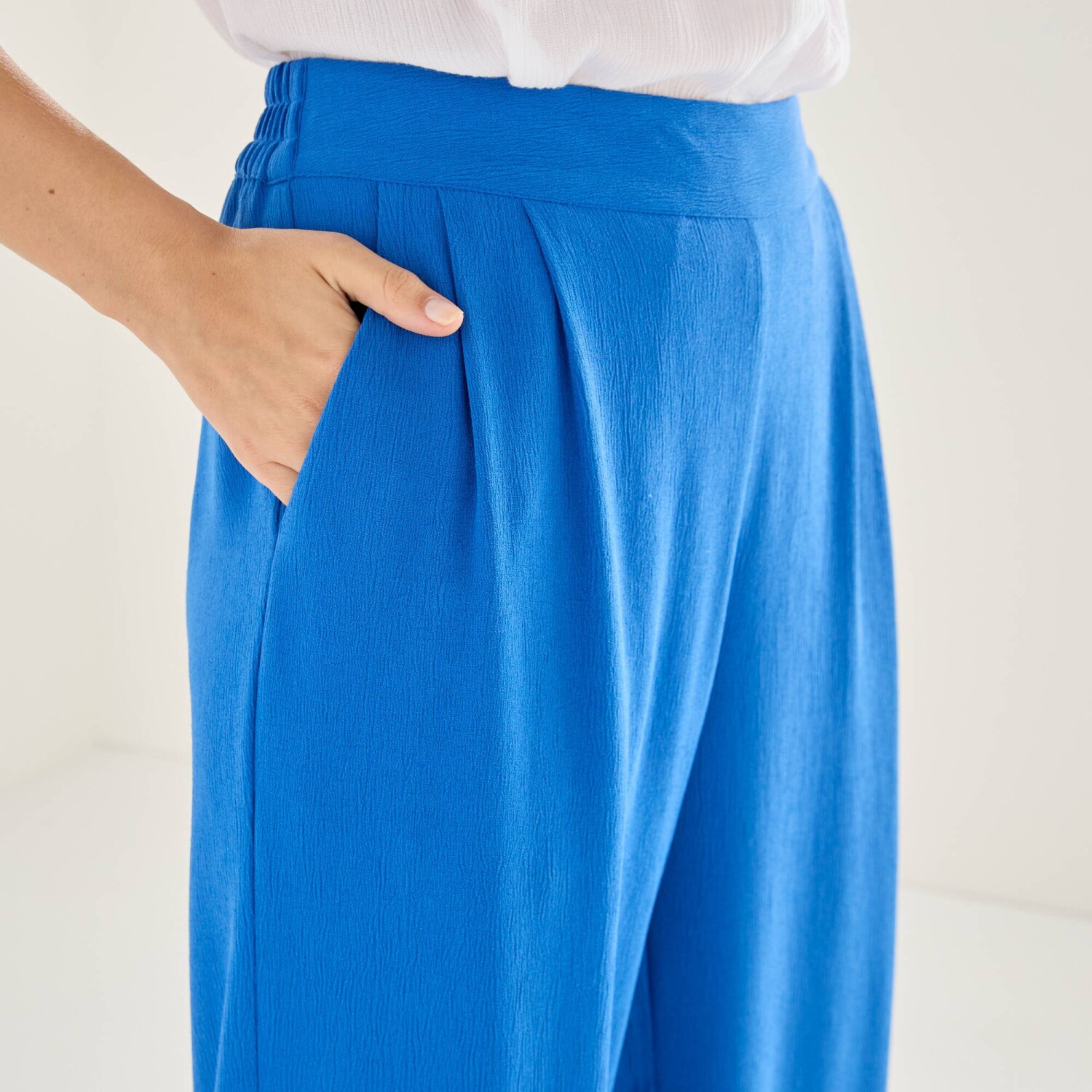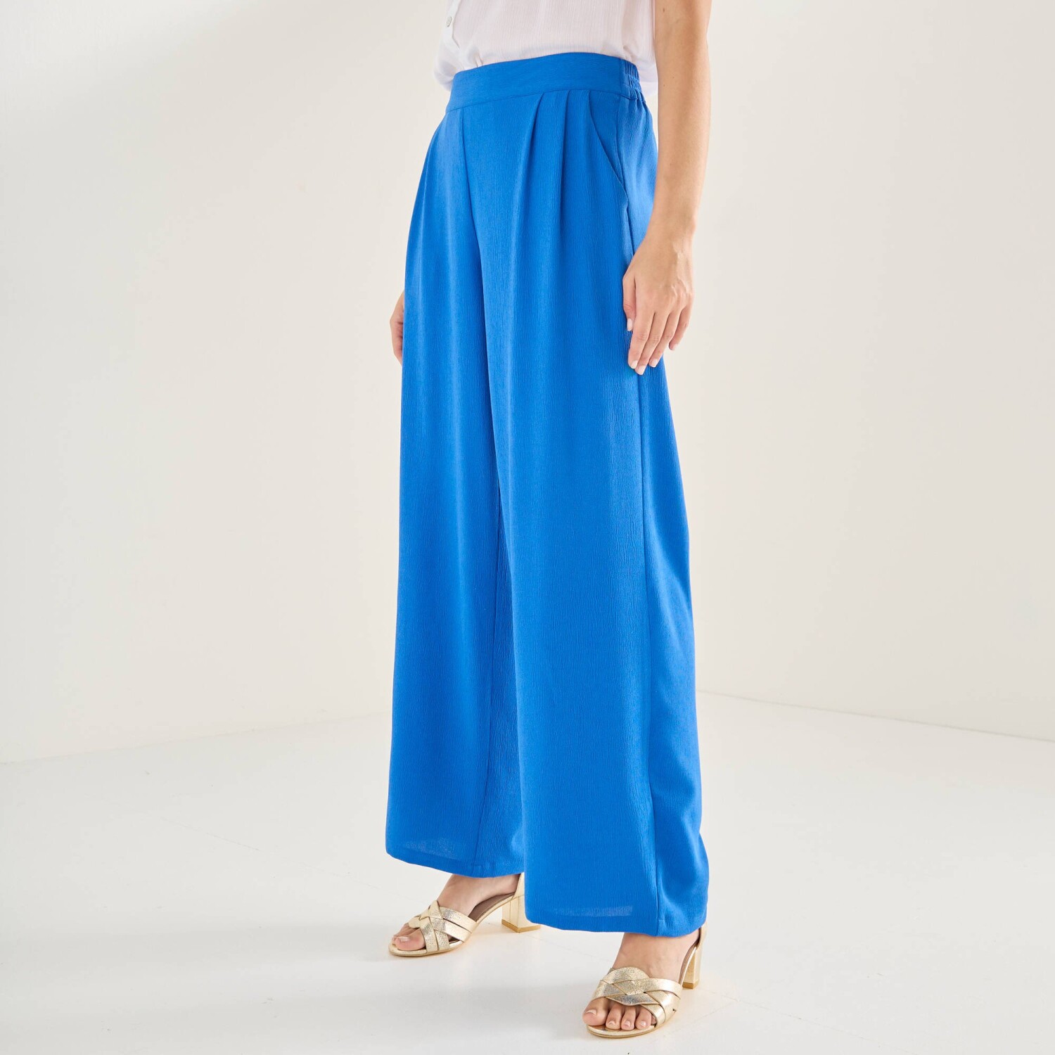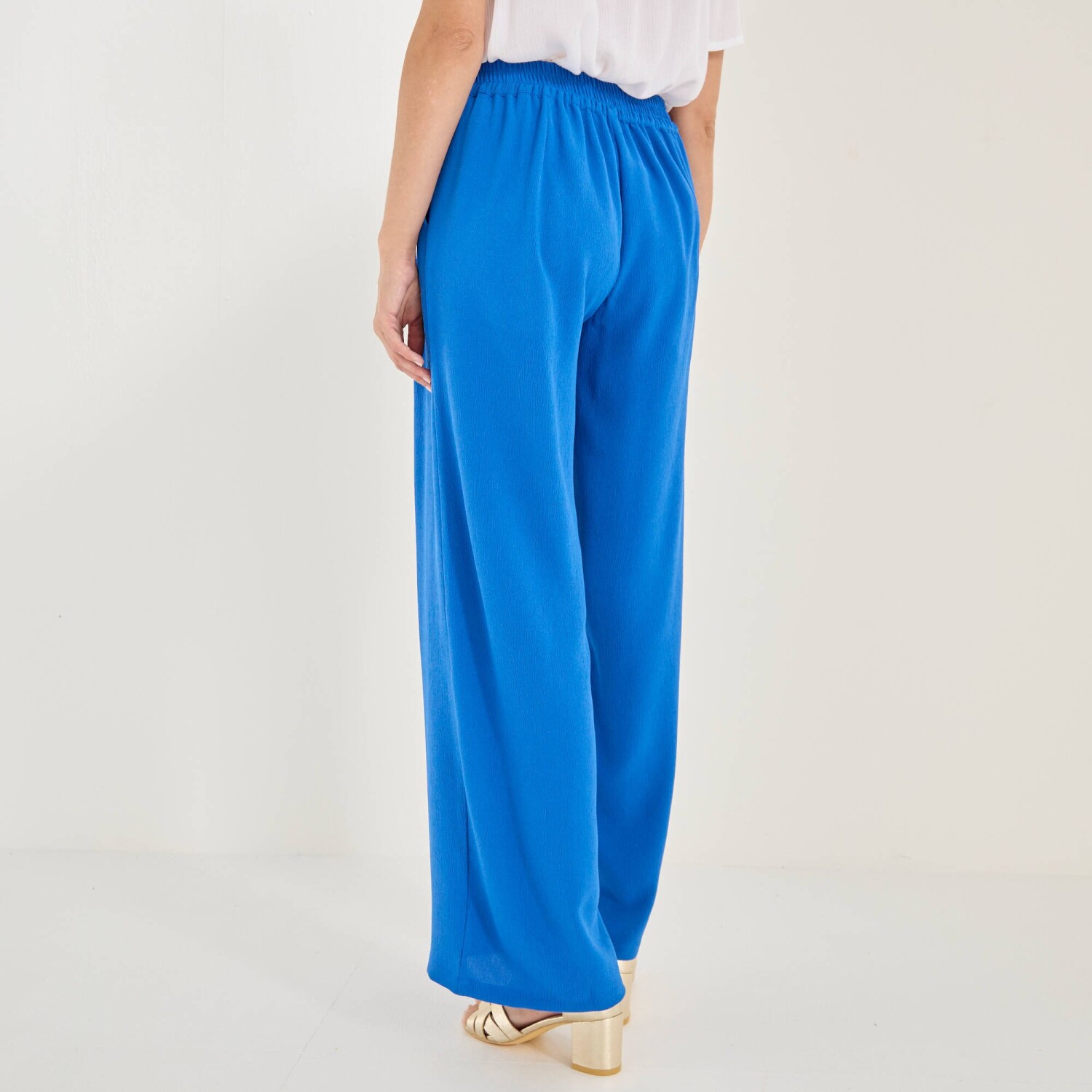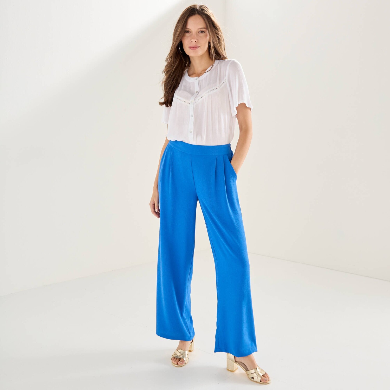 S opticky prodlužujícím efektem a příjemné na nošení, široké kalhoty s vysokým pasem jsou pravým módním pokladem. Vzdušný úplet. Vpředu plochý pas, vzadu pružný. 2 klínové kapsy vpředu. Sklady vpředu. Záševky vzadu. Zakončení lemem. Lze prát v pračce.