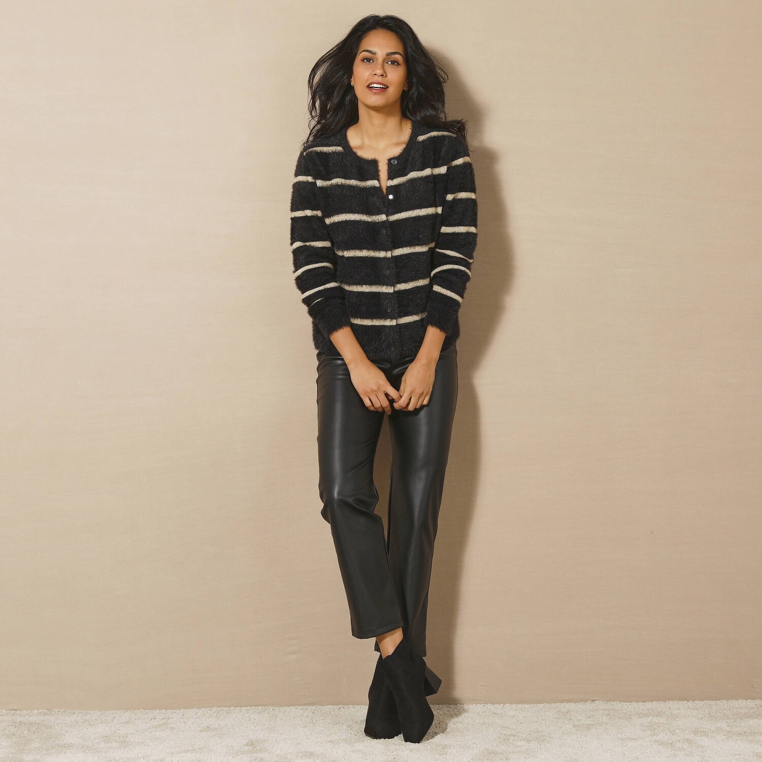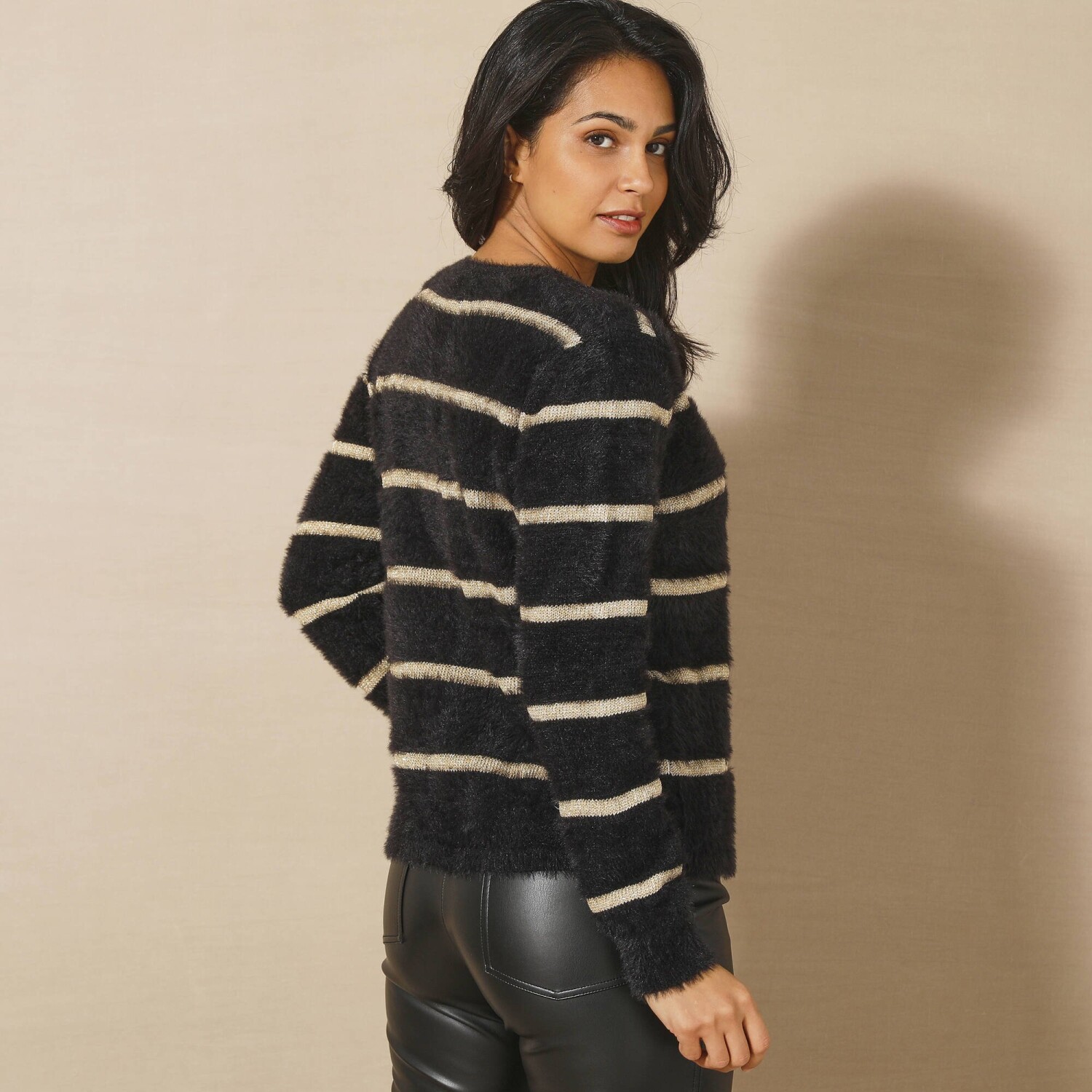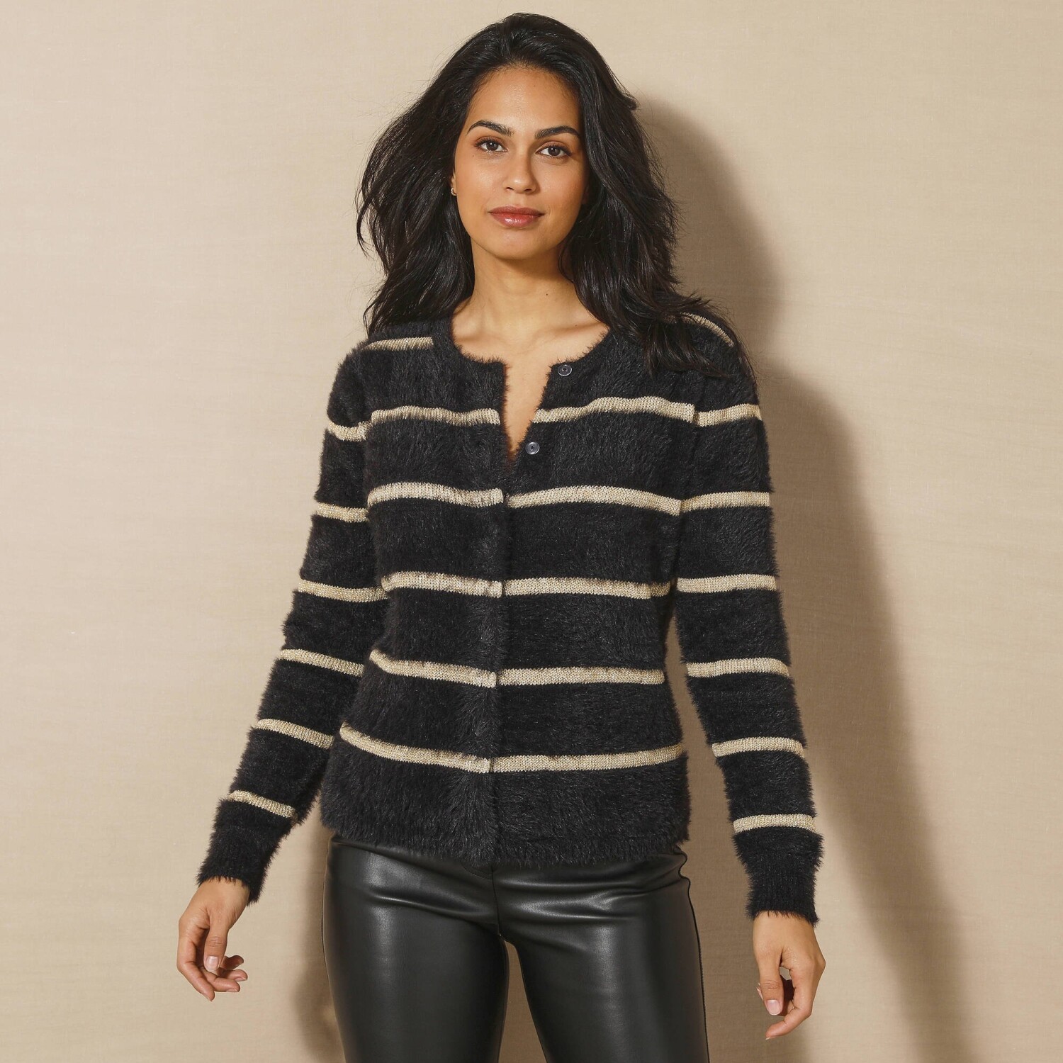 Měkký svetr se zlatými proužky rozzáří celý Váš outfit. Jemný úplet s vlasem příjemný na nošení. Volný střih. Kulatý výstřih. Vpředu knoflíková léga. Dlouhé rukávy. Rovný dolní lem. Lze prát v pračce.