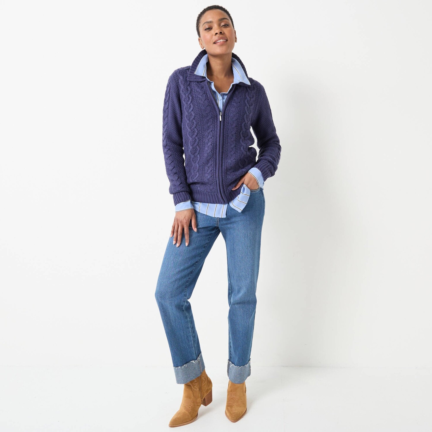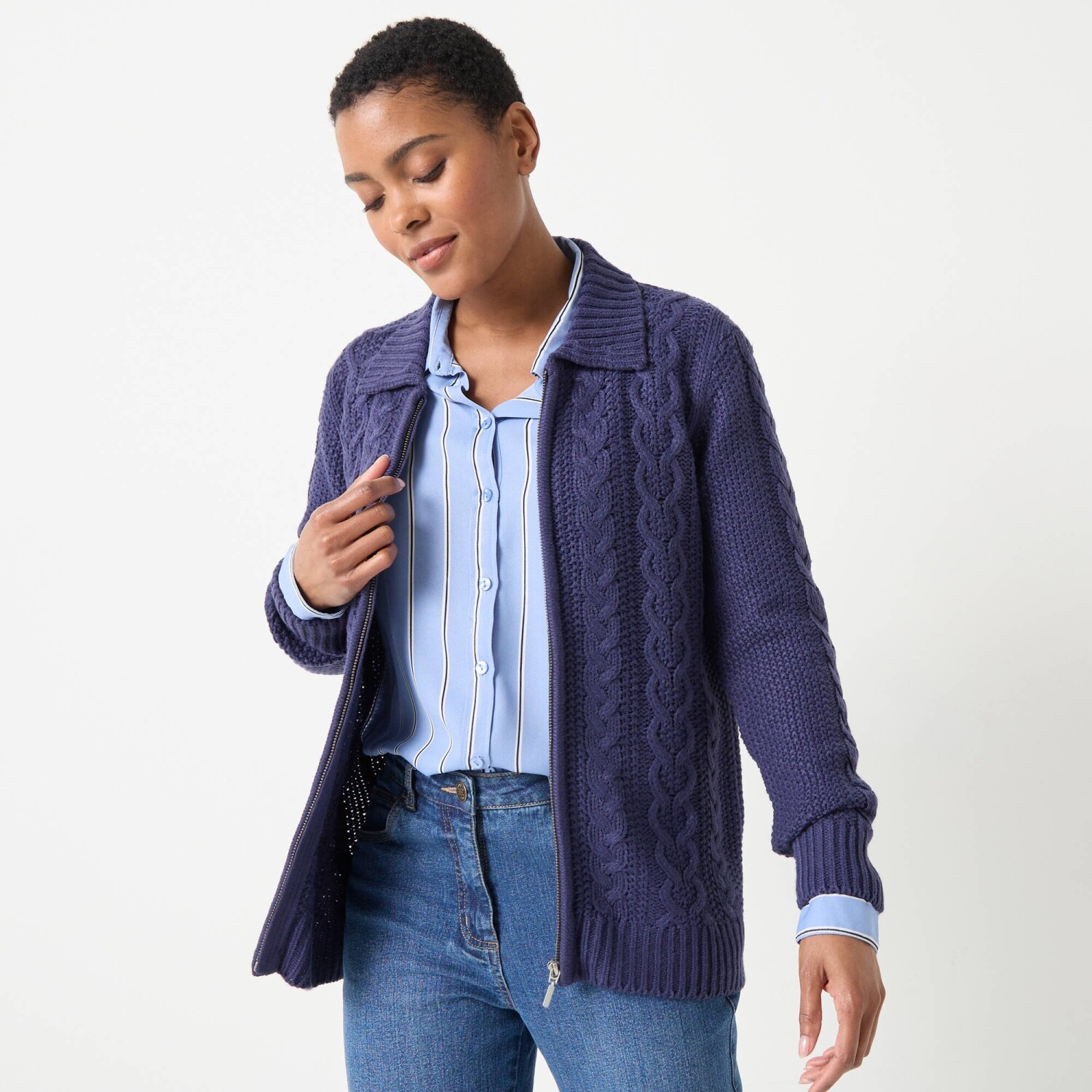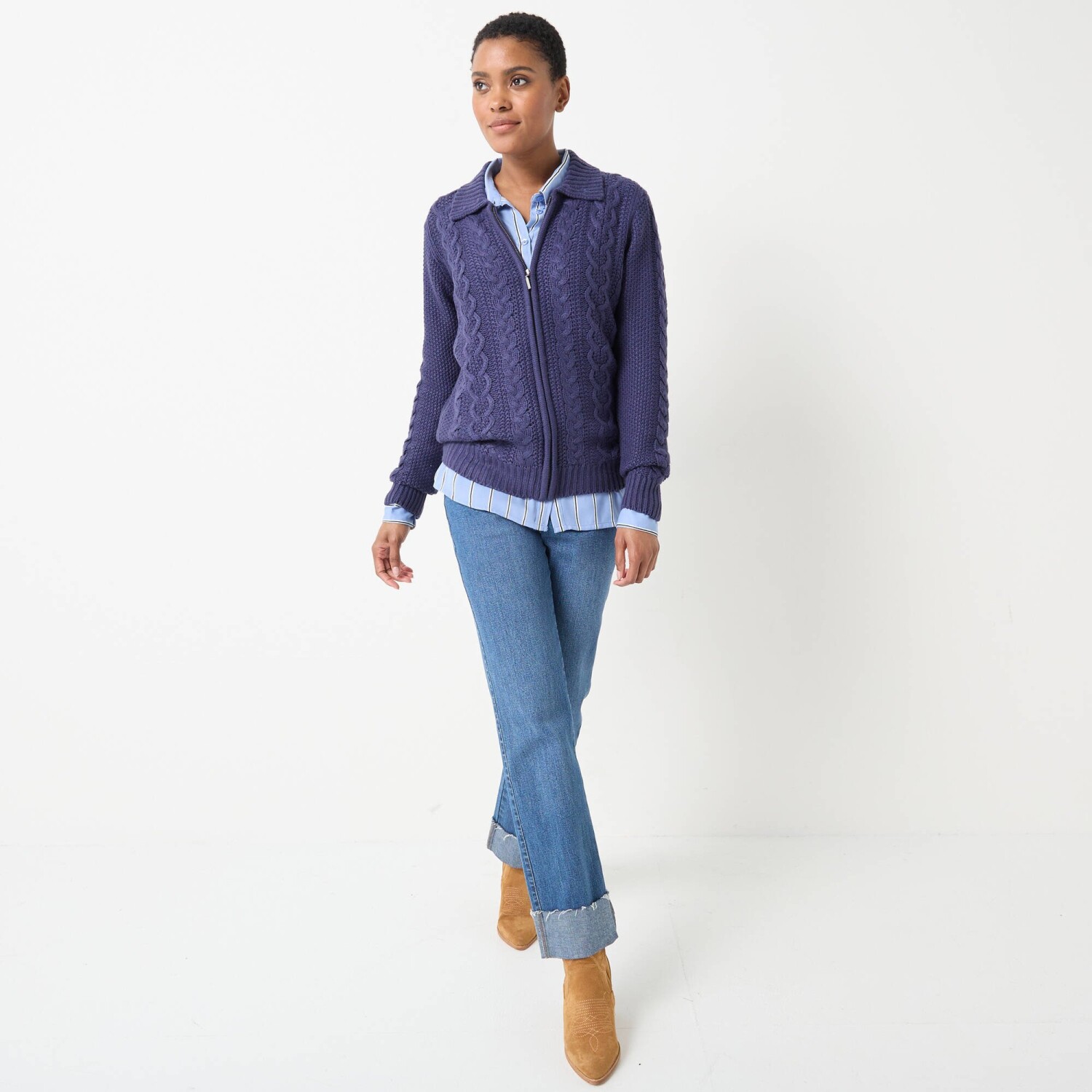 Toužíte po absolutním pohodlí? Pak sáhněte po svetru na zip. Jemný na dotek. Originální pletené vzory. Polo límeček se žebrováním 2x2. Vpředu na zip. Dlouhé, mírně zúžené rukávy. Rovný dolní lem. Lze prát v pračce.