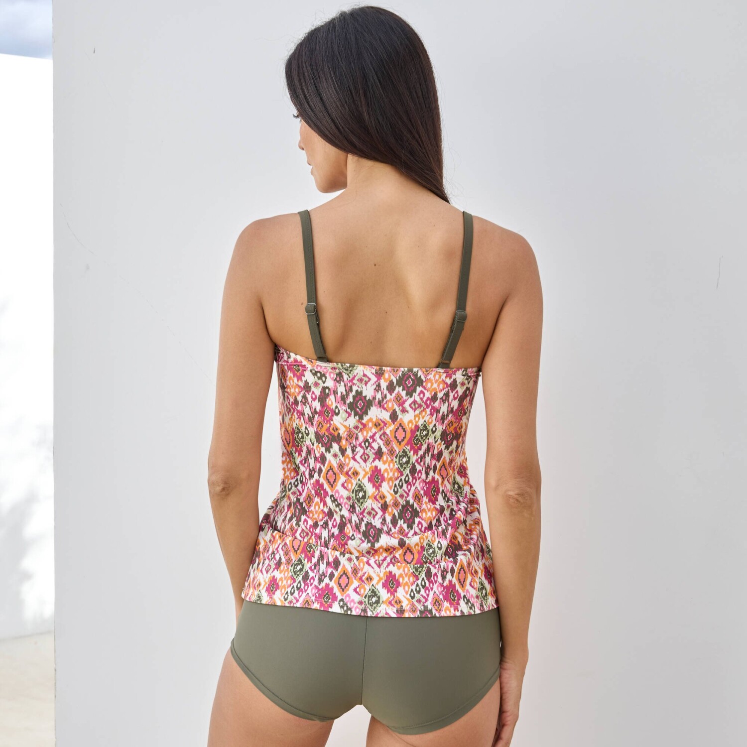 Dejte sbohem komplexům a pořiďte si plavkový tankiny top s potiskem. Kolekce Tanza s potiskem etno exotického vzoru. Hluboký výstřih do "V". Integrovaná podprsenka s podšívkou z mikrovlákna a s vyjímatelnými košíčky. Mezi prsy mašlička. Vzadu nastavitelná ramínka. Standard 100 podle Oeko-Tex (n° CQ 1216 / 3 IFTH). Tato známka označuje textilní výrobky, které byly podrobeny laboratorním testům na široké spektrum škodlivých látek a výrobek je bezpečný nad rámec platných norem. Lze prát v pračce. Po každém použití doporučujeme vymáchat v čisté vodě. Odolné mořské vodě a chlóru, vhodné na pláž i do bazénu.