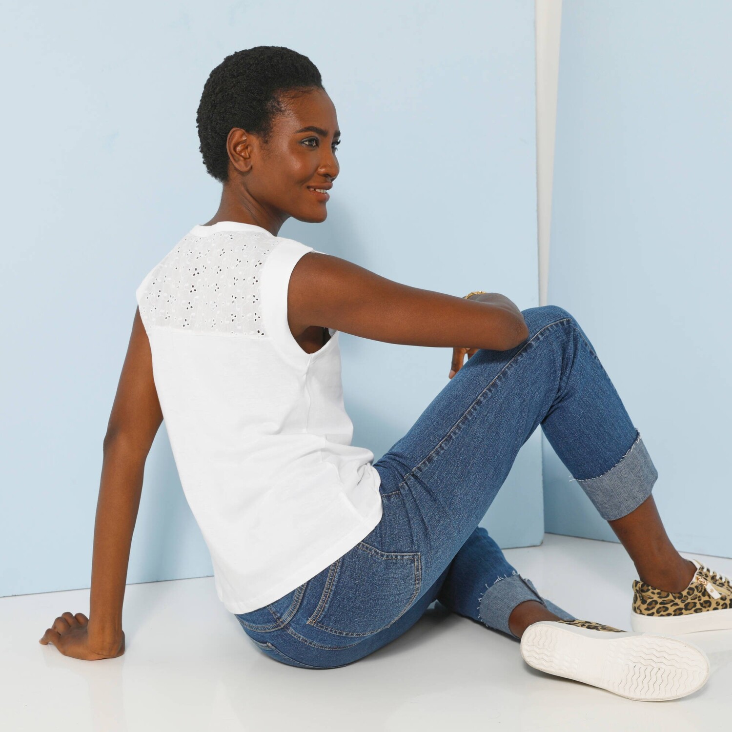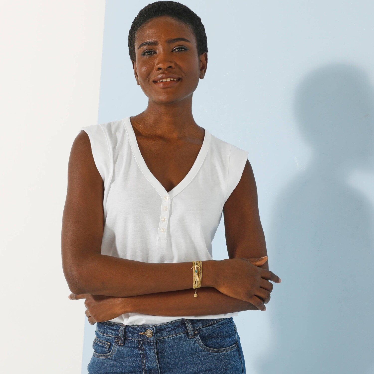 Madeira dodá originálnímu look každému kousku oblečení. Mírně zakulacený výstřih do V s knoflíkovou légou. Široká ramínka se vsadkou. Rovný dolní lem. Standard 100 podle Oeko-Tex (n° CQ 1216 / 3 IFTH). Tato známka označuje textilní výrobky, které byly podrobeny laboratorním testům na široké spektrum škodlivých látek a výrobek je bezpečný nad rámec platných norem. Lze prát v pračce.