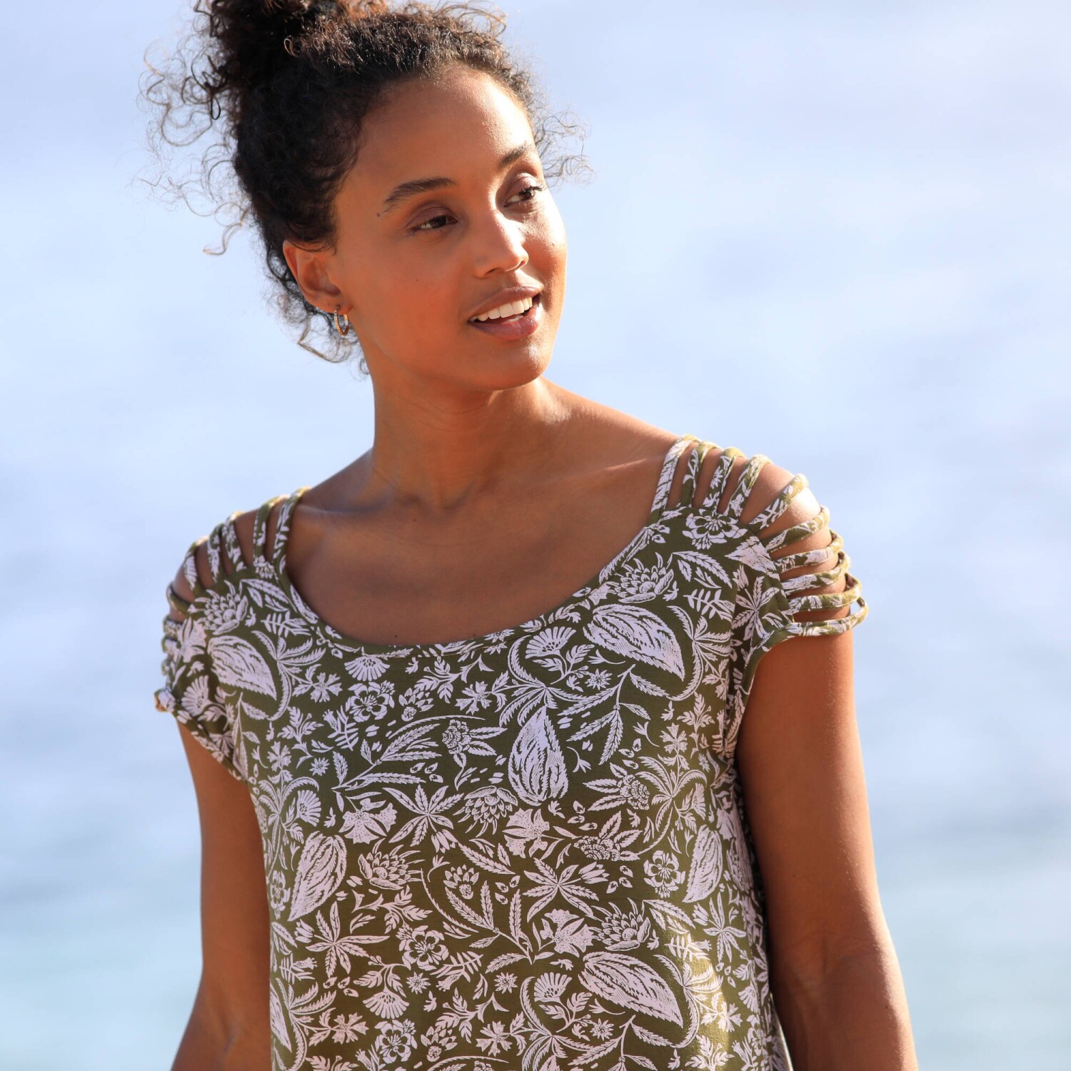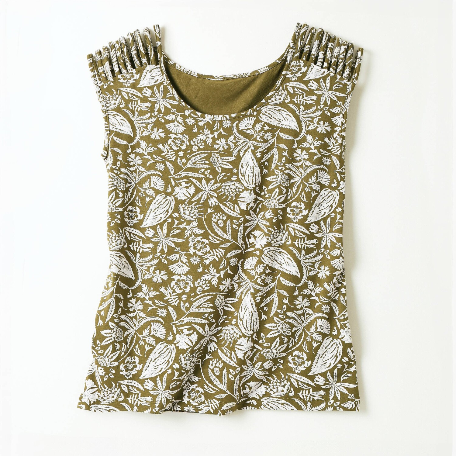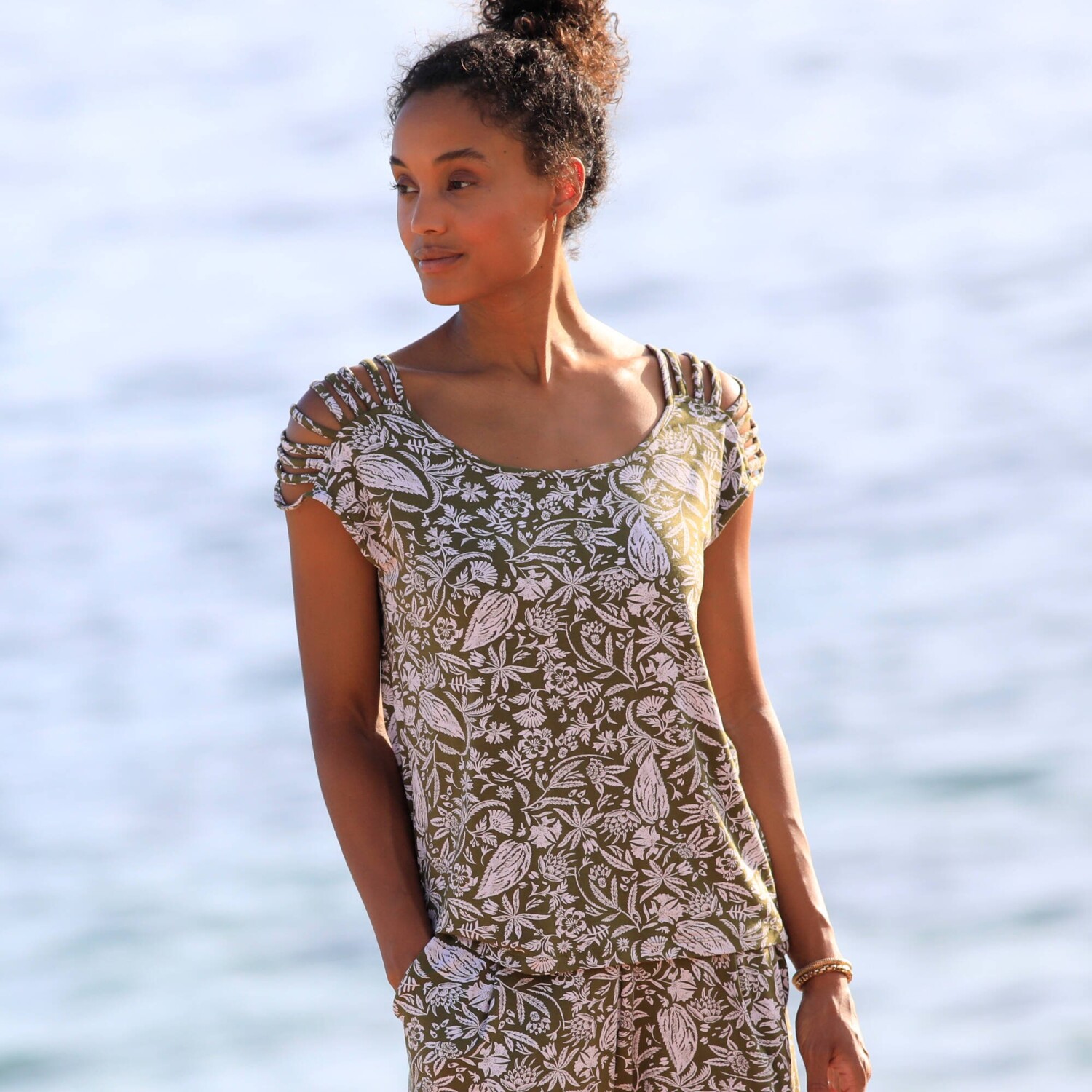 Svůdné šněrování na rameni a dvoubarevný potisk, podlehněte i Vy kouzlu tohoto trička. Vzdušný úplet, snadná údržba. Módní střih. Kulatý výstřih. Pevné šňůrky na rameni tvořící krátké rukávy. Rovný dolní lem. Lze prát v pračce.