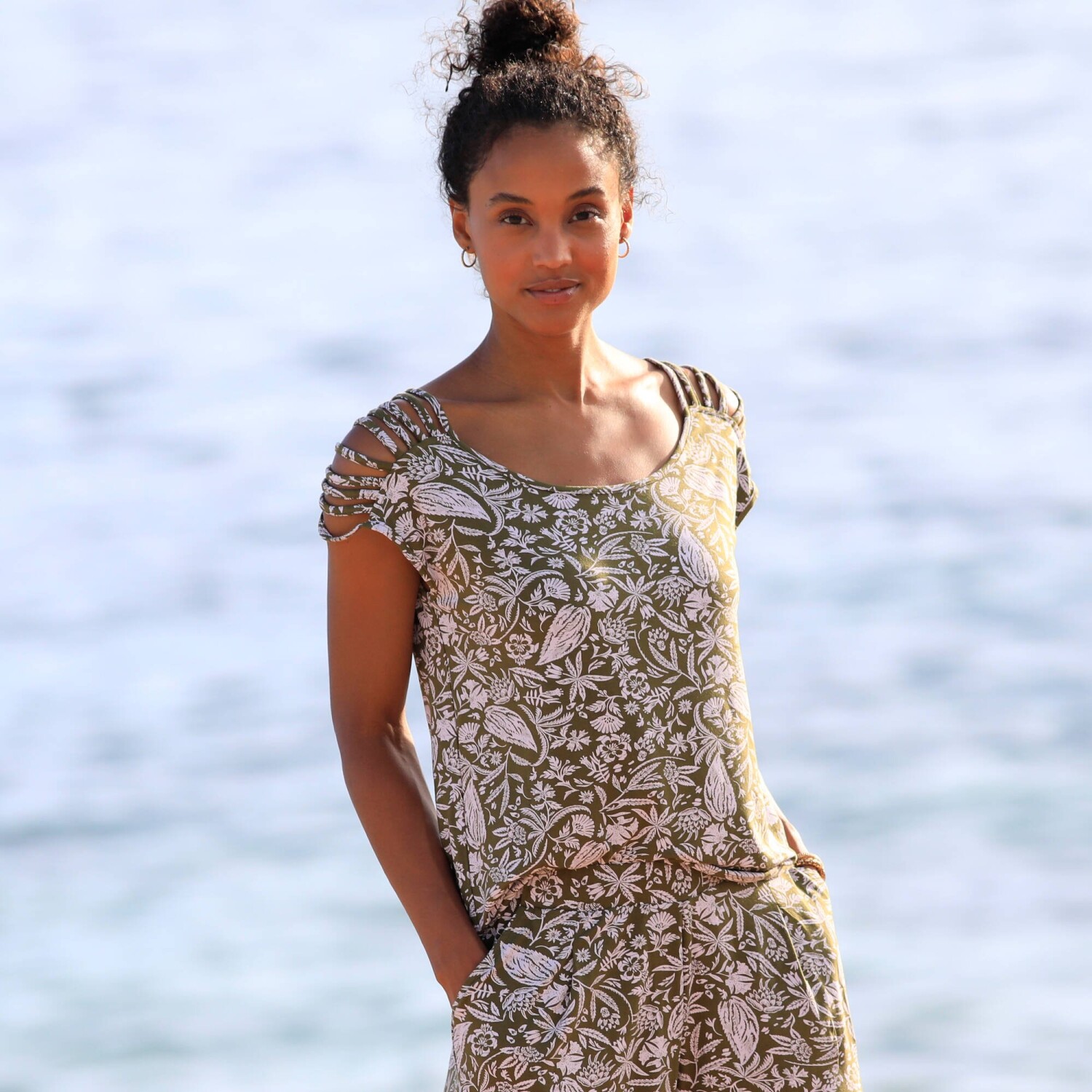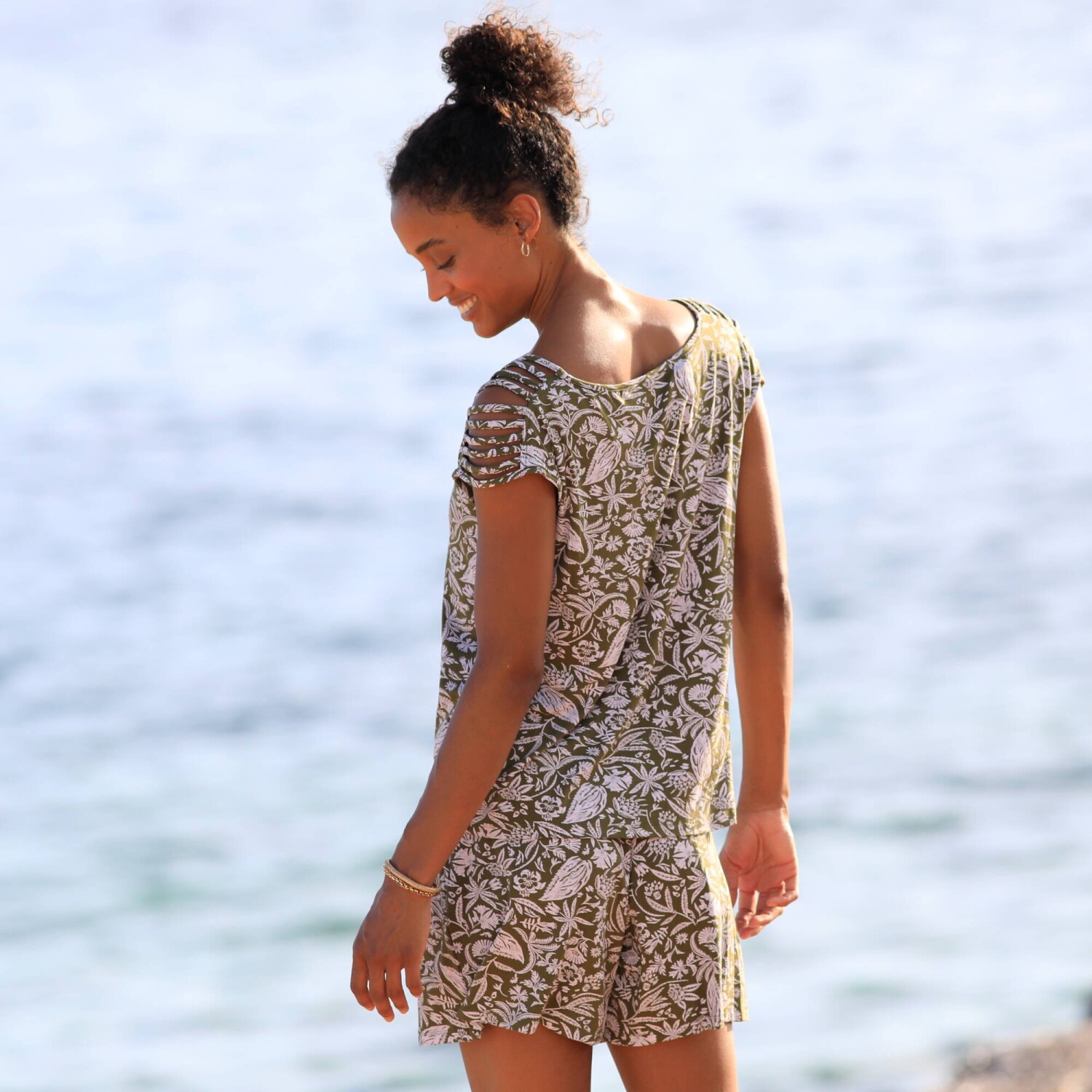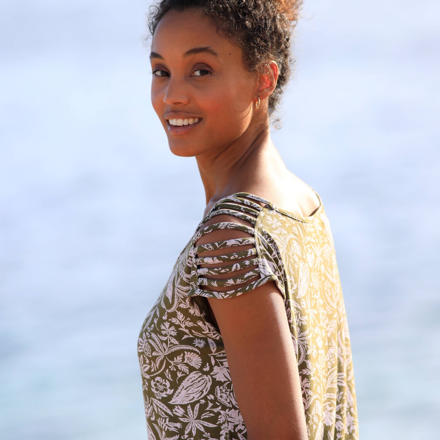 Svůdné šněrování na rameni a dvoubarevný potisk, podlehněte i Vy kouzlu tohoto trička. Vzdušný úplet, snadná údržba. Módní střih. Kulatý výstřih. Pevné šňůrky na rameni tvořící krátké rukávy. Rovný dolní lem. Lze prát v pračce.
