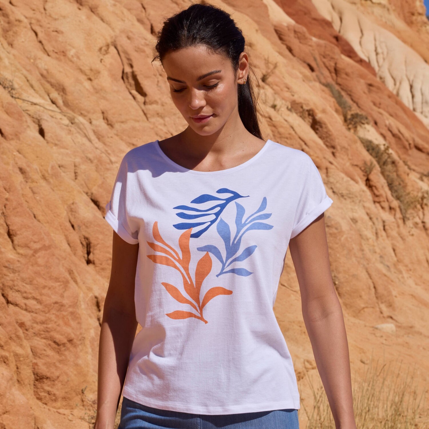 Obohaťte Váš šatník tričkem s potiskem letního motivu. Žerzej snadný na údržbu. Kulatý výstřih. Spadlá ramena. Rukávy s ohrnutím. Vpředu středový potisk. Rovný spodní lem. Standard 100 podle Oeko-Tex (n° CQ 1216 / 3 IFTH). Tato známka označuje textilní výrobky, které byly podrobeny laboratorním testům na široké spektrum škodlivých látek a výrobek je bezpečný nad rámec platných norem. Lze prát v pračce.