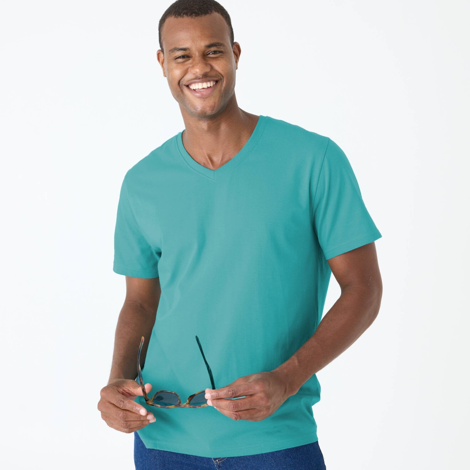 Základním kouskem šatníku je tričko s výstřihem do V a krátkými rukávy. Výstřih do V. Krátké rukávy. Rovný dolní lem. Standard 100 podle Oeko-Tex (n° CQ 1216 / 3 IFTH). Tato známka označuje textilní výrobky, které byly podrobeny laboratorním testům na široké spektrum škodlivých látek a výrobek je bezpečný nad rámec platných norem. Lze prát v pračce.