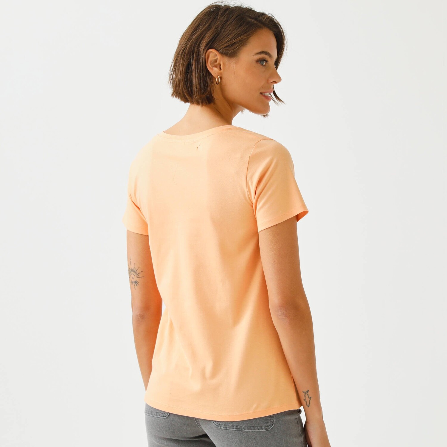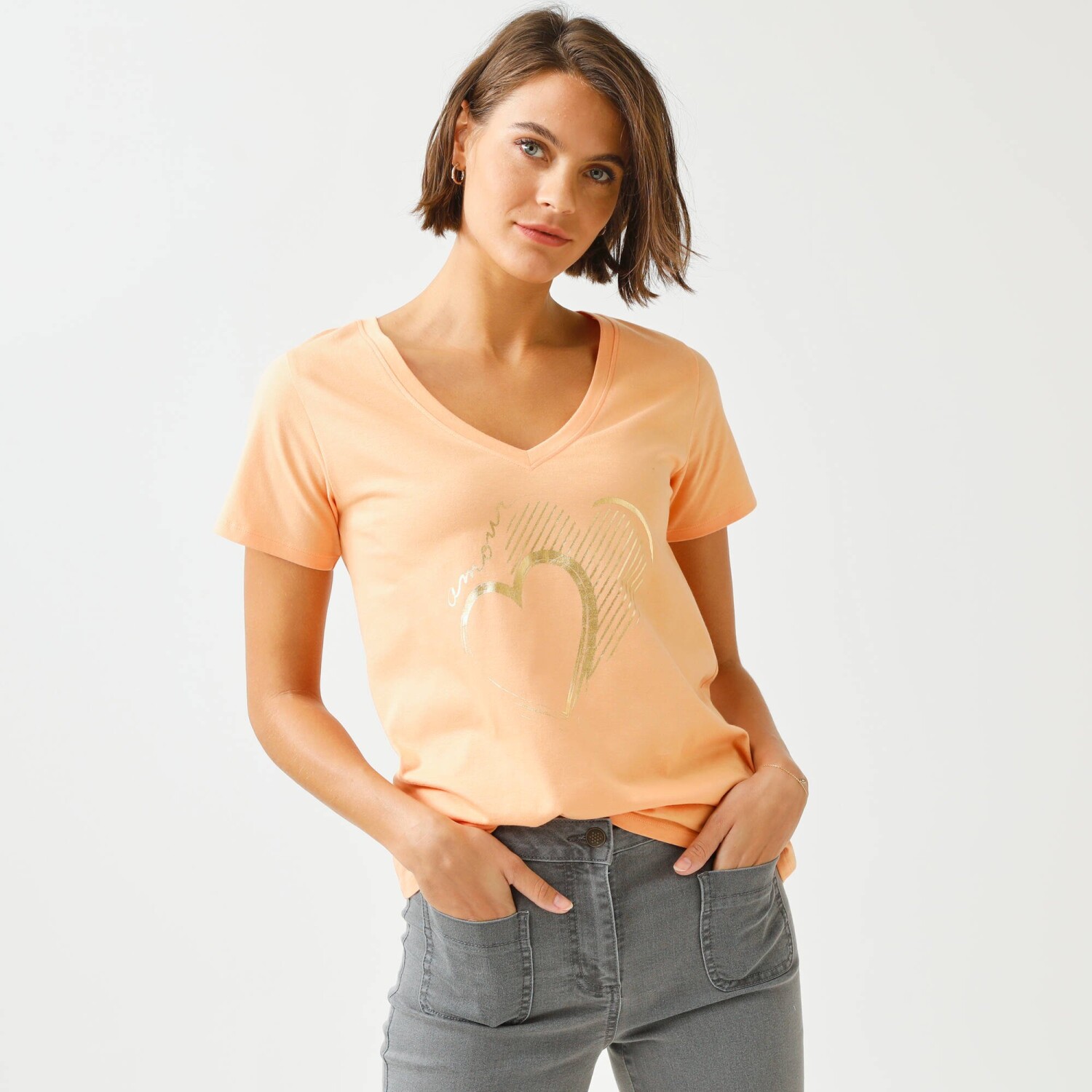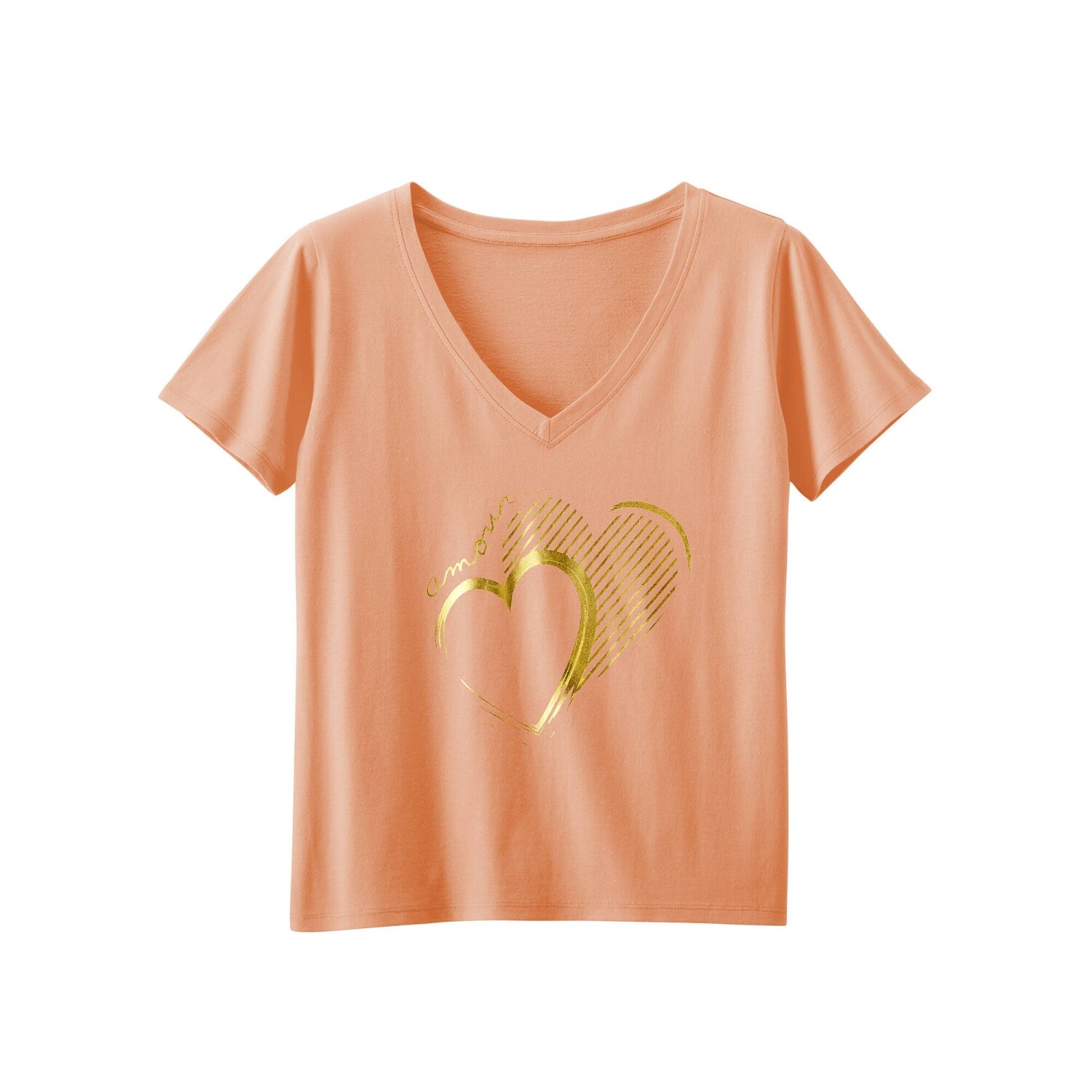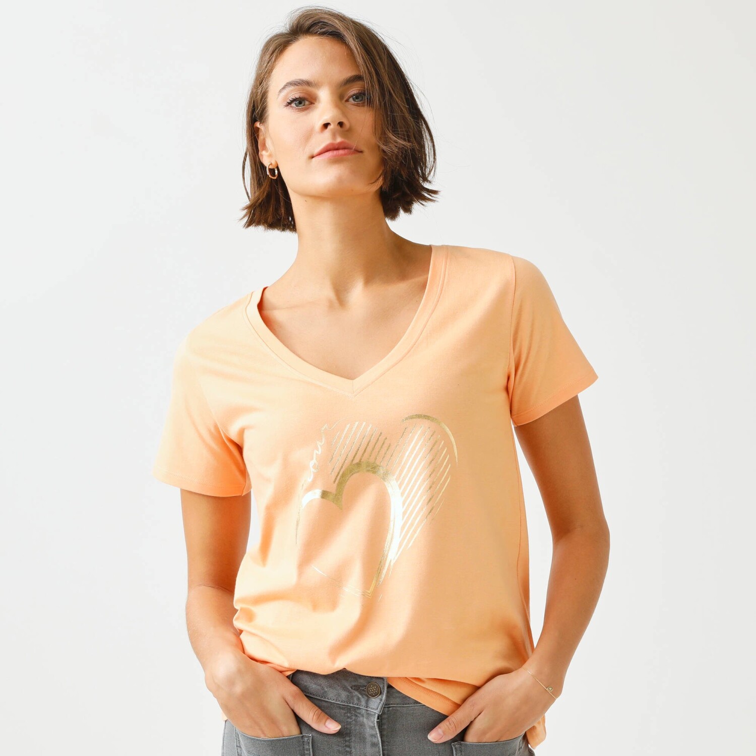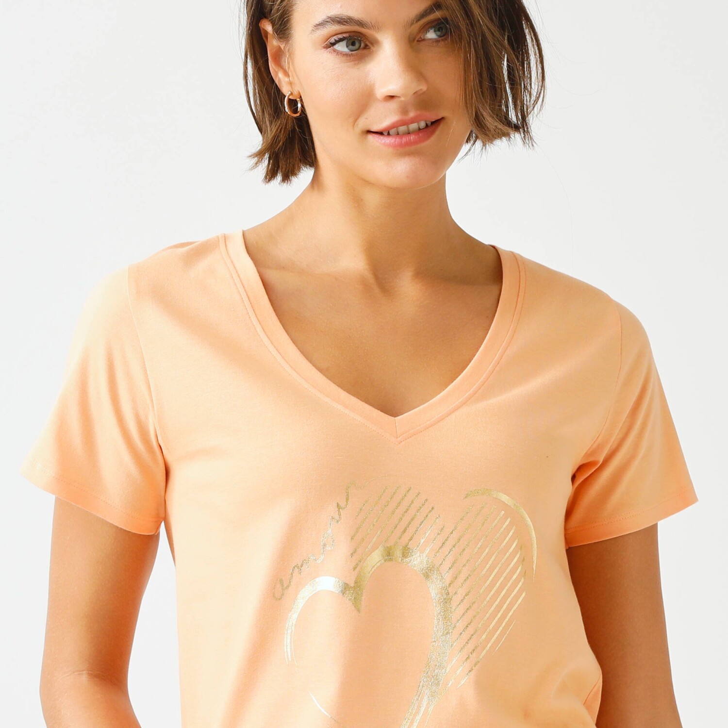Zamilujte si i Vy tričko s výstřihem do V a zlatým potiskem. Vzdušný lehký úplet. Zakulacený výstřih do "V". Krátké rukávy. Rovný dolní lem. Standard 100 podle Oeko-Tex (n° CQ 1216 / 3 IFTH). Tato známka označuje textilní výrobky, které byly podrobeny laboratorním testům na široké spektrum škodlivých látek a výrobek je bezpečný nad rámec platných norem. Lze prát v pračce.