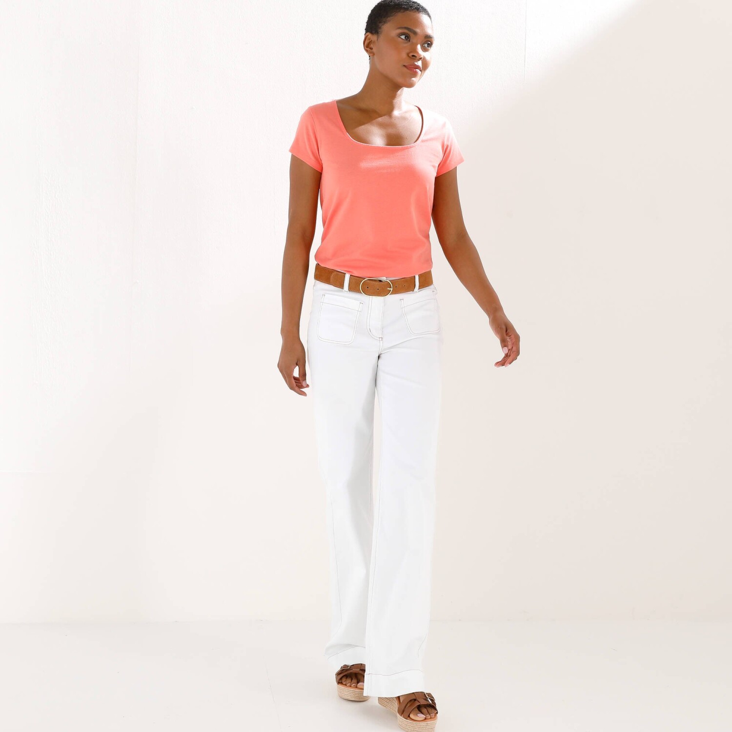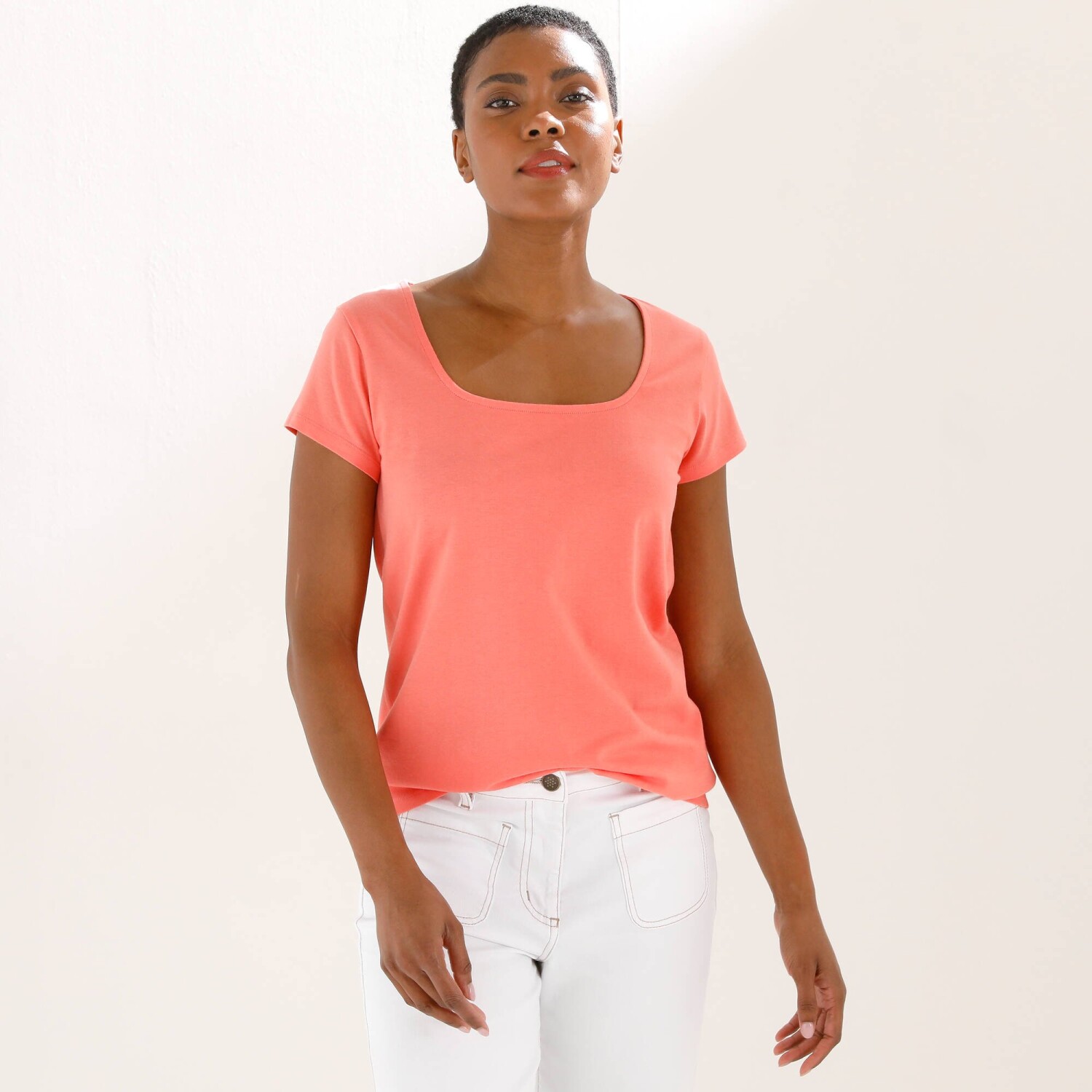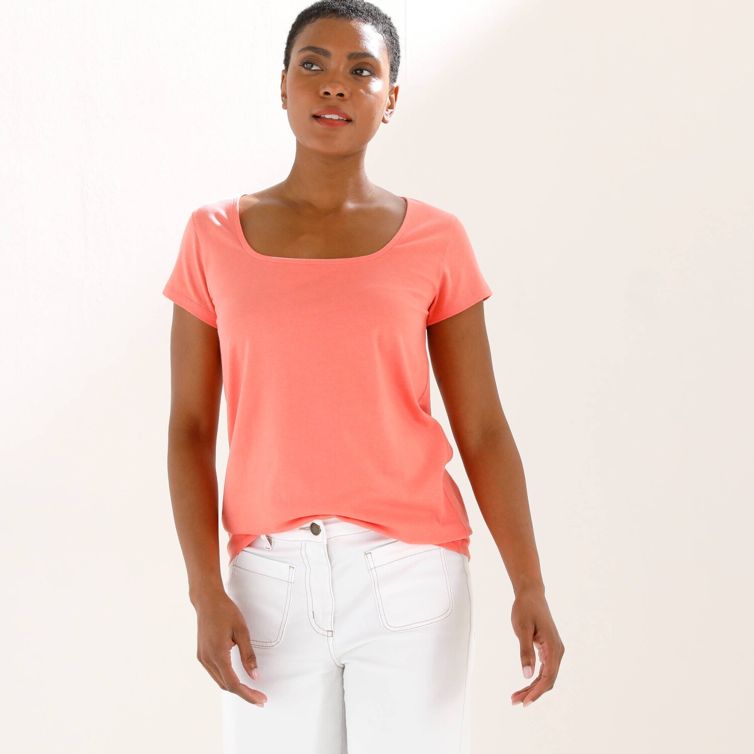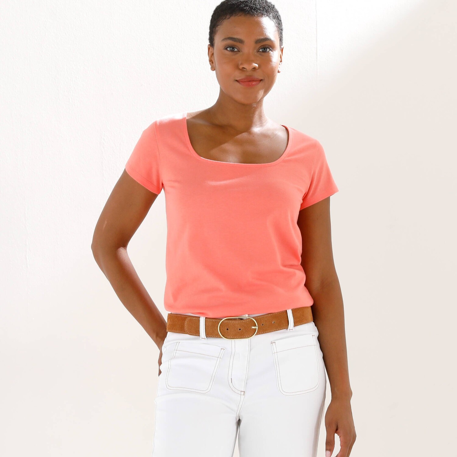 Základem letního šatníku je tričko se čvercovým výstřihem ze 100% bavlny. Svěží a lehký žerzej. Čvercový výstřih. Krátké rukávy. Rovný spodní lem. Standard 100 podle Oeko-Tex (n° CQ 1216 / 3 IFTH). Tato známka označuje textilní výrobky, které byly podrobeny laboratorním testům na široké spektrum škodlivých látek a výrobek je bezpečný nad rámec platných norem. Lze prát v pračce.
