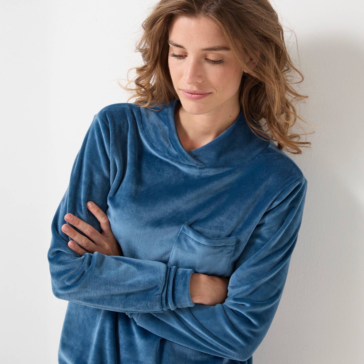 Je radost zachumlat se do velurového pyžama s originálním překřížením. Z hebkého hřejivého veluru. Tričko se stojáčkem a překřížením vpředu. 1 náprsní kapsa. Dlouhé rukávy se zúženými konci, které nepropouští chlad. Rovný spodní lem. Kalhoty s pružným pasem a středovým švem. 2 postranní kapsy. Rovné nohavice. Lze prát v pračce.