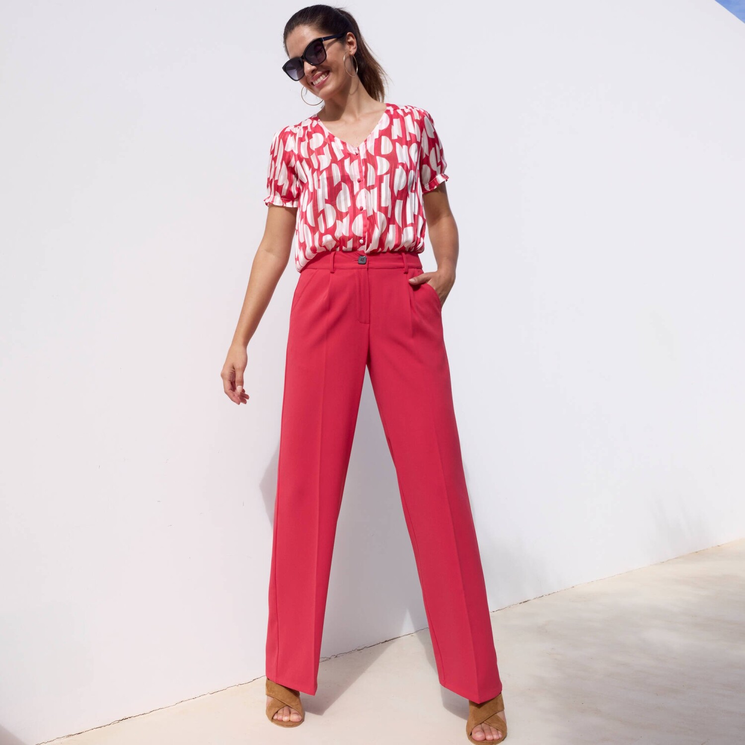 Naším srdcovým tipem je halenka s dvoubarevným potiskem. Zakulacený výstřih do V. Vpředu knoflíková léga. Vpředu členitý střih ramen s nařasením. V ramenou nařasení. Krátké halenkové rukávy s pružným zakončením. Rovný dolní lem. Lze prát v pračce.