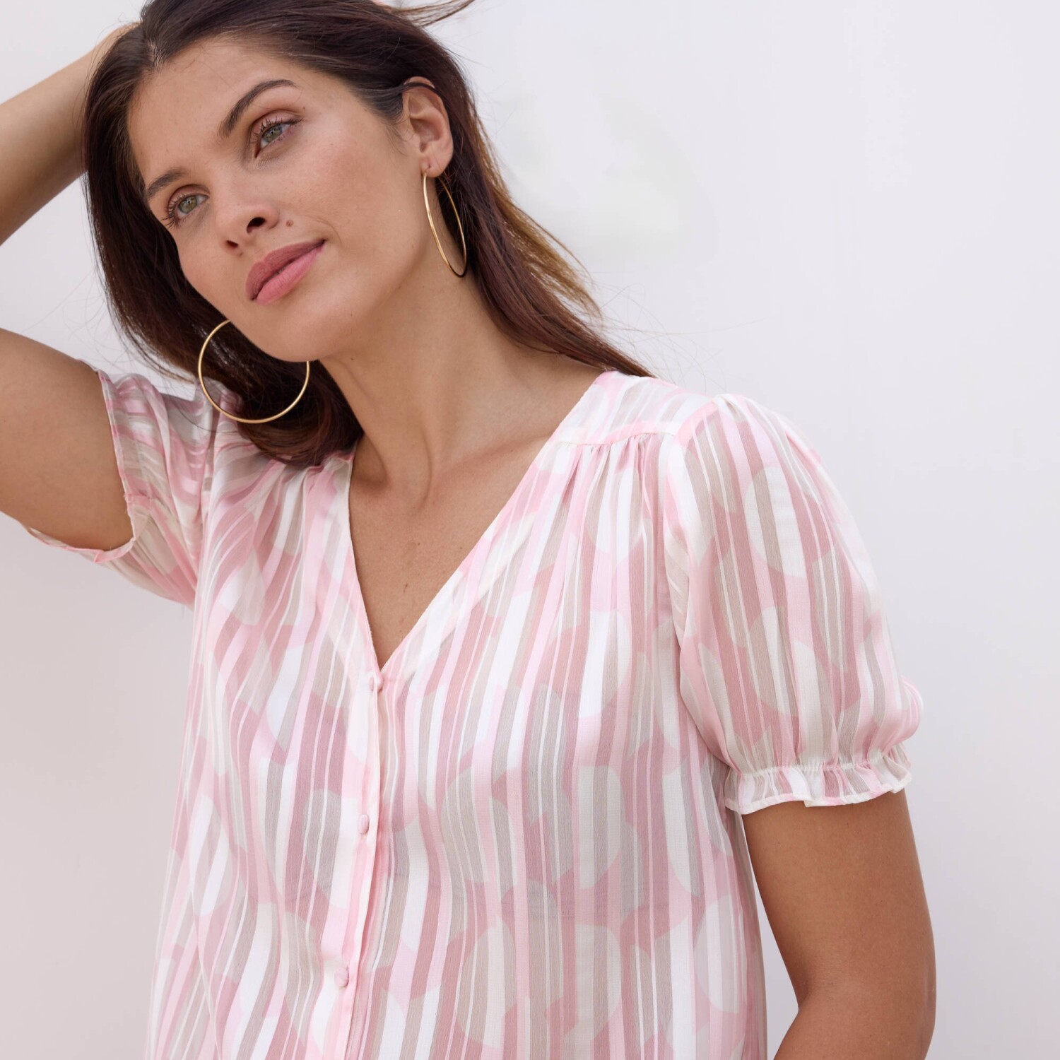 Naším srdcovým tipem je halenka s dvoubarevným potiskem. Zakulacený výstřih do V. Vpředu knoflíková léga. Vpředu členitý střih ramen s nařasením. V ramenou nařasení. Krátké halenkové rukávy s pružným zakončením. Rovný dolní lem. Lze prát v pračce.