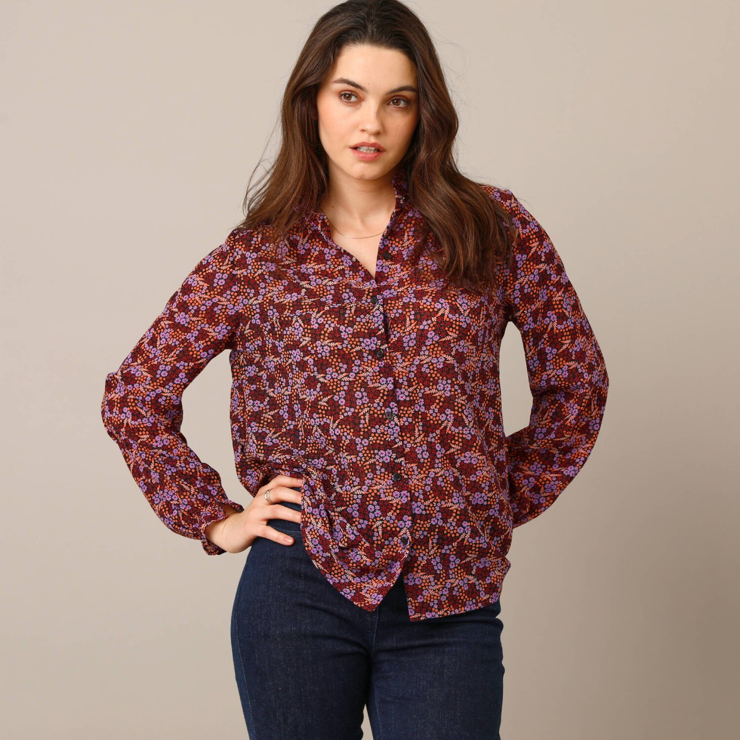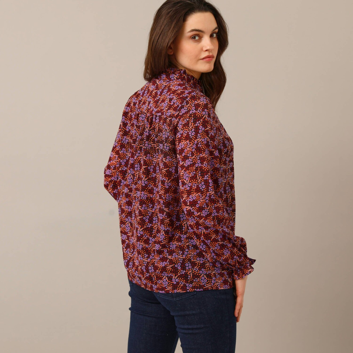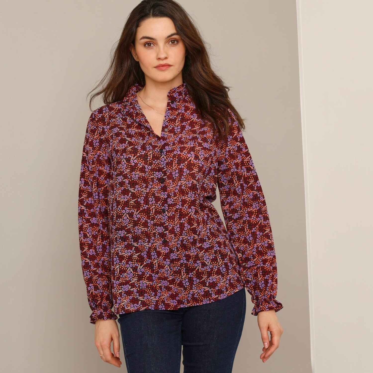 Halenka posetá malými kvítky rozhodně nezůstane tuto sezónu bez povšimnutí! Ve splývavém rovném střihu, který se hodí pro každý typ postavy. Vzdušný materiál. Stojáček s volánem. Vpředu celopropínací. Dlouhé rukávy. Pružné konce rukávů s volánem. Vzadu vsadka a nařasení. Rovný dolní lem. Lze prát v pračce.